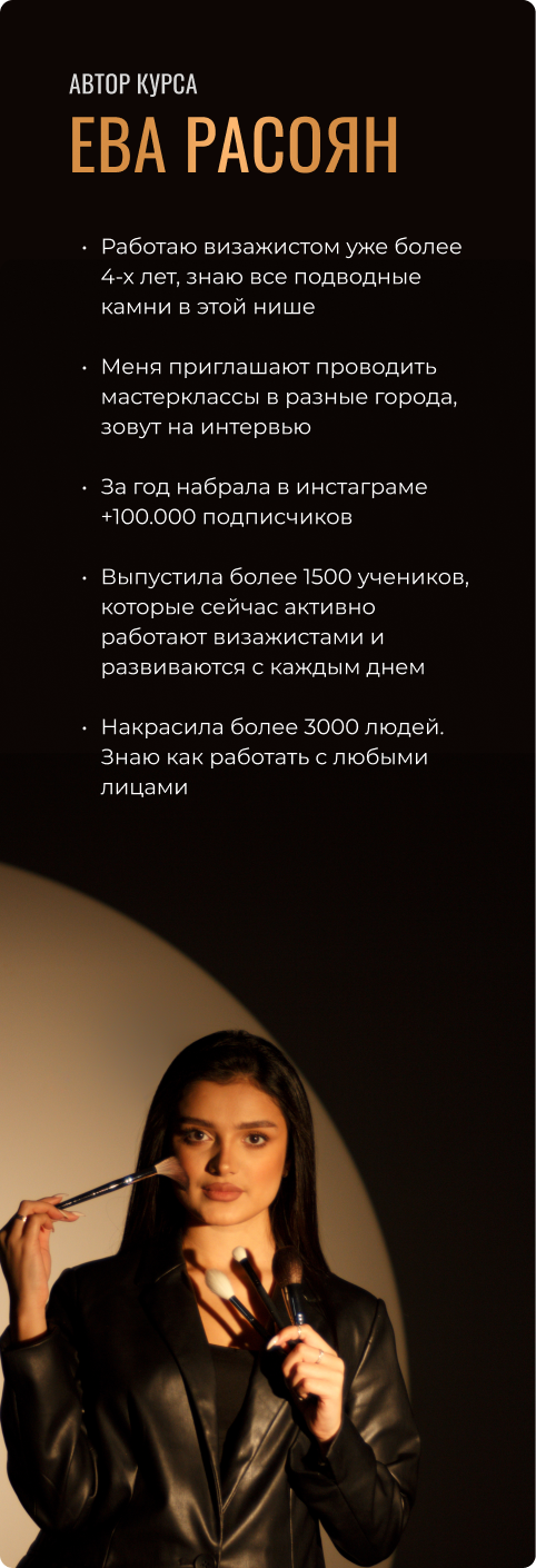 Упакуете свой аккаунт в инстаграме так, чтобы он отличал вас от других визажистов и выражал именно вас, как мастера. Построите стратегию развития своего аккаунта, которая позволит привлечь вам множество клиентов и аудитории.